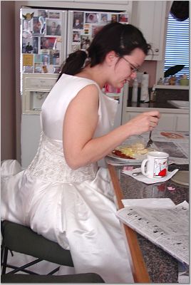 The next morning, she made breakfast while I lounged around in my wedding dress. One last time to wear it before we send it off to be cleaned!