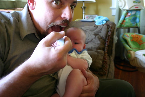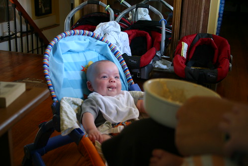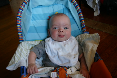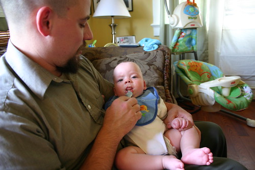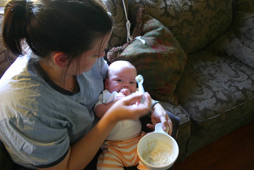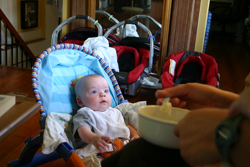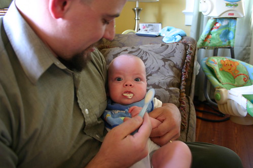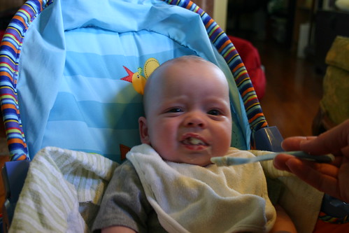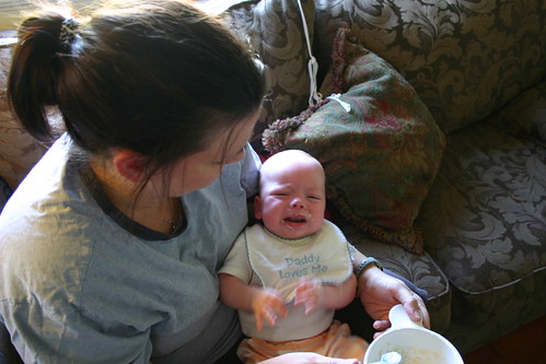 Last week, we decided to let the boys try rice cereal. Let’s just say we’re going to wait a little while before we try again. Heh.