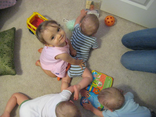 – Saturday morning, I took the boys to hang out with some friends and their babies at the children’s museum. They have a great area for babies to crawl around in, so I’m definitely going to have to go back there. Aaaand, the boys were discovered! The owner of a fancy children’s boutique saw them and got my info – she wants the boys to be in an upcoming catalog. Exciting!