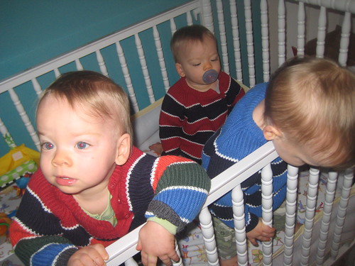Here’s a few cute pictures from the other day of the boys wearing the sweaters that my friend Laurie gave them. Aw!