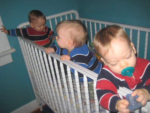 Anyway, then Oliver woke up with a fever yesterday, so I brought him to work with me. He napped for a while and I was able to be somewhat productive. His fever was gone today, so all three went to daycare. I got a call on my lunchbreak that their legs seemed swollen. How strange, so I went to check them out. They weren’t swollen, but they were cranky as all heck, so I ran to my house to get some Motrin. I think they’re getting their molars. Or that’s my theory. If they’re not, then I might run away when they do get them.