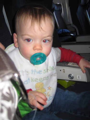 Got up while it was still dark out. Sob. Got Linus up and dressed and to the airport. Had much fun lugging 24 lb baby in Bjorn (over the weight limit, shhhh), suitcase, huge carseat, and diaper bag. Made it onto plane without incident. We were moved to Economy Plus (yay!) and had our own row, as well as empty rows in front of and behind us.