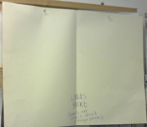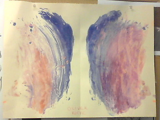 Yesterday when I went to pick up the boys from daycare, I was happily surprised to see that they’d done their first artwork! They did fingerpainting on half the page, then it was folded in half to do a mirror image (and presumably blot up some of the excess paint applied by the overexuberant artists.)