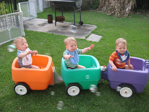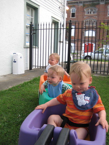 – Linus has been throwing full-on temper tantrums. It’s kind of funny, but I know it won’t be for long. I think it’s time to investigate some books on toddler discipline. I’ve heard good things (from other triplet moms) about Love & Logic and 1,2,3 Magic. We’ll see.