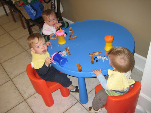 The picture of them sitting at thier table is very cute! I loved the day that I was able to throw the high chairs out of the house for good. I had so much more room! I am sure you will too.