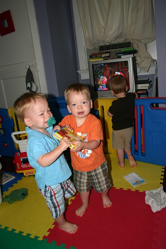 Here’s what happens when someone (in this example, Oliver, in orange) wants something (like this Sesame Street book) that someone else (Miles, in blue) has. Screaming and tears ensue. Just be glad this isn’t a video.