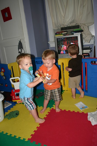 Here’s what happens when someone (in this example, Oliver, in orange) wants something (like this Sesame Street book) that someone else (Miles, in blue) has. Screaming and tears ensue. Just be glad this isn’t a video.