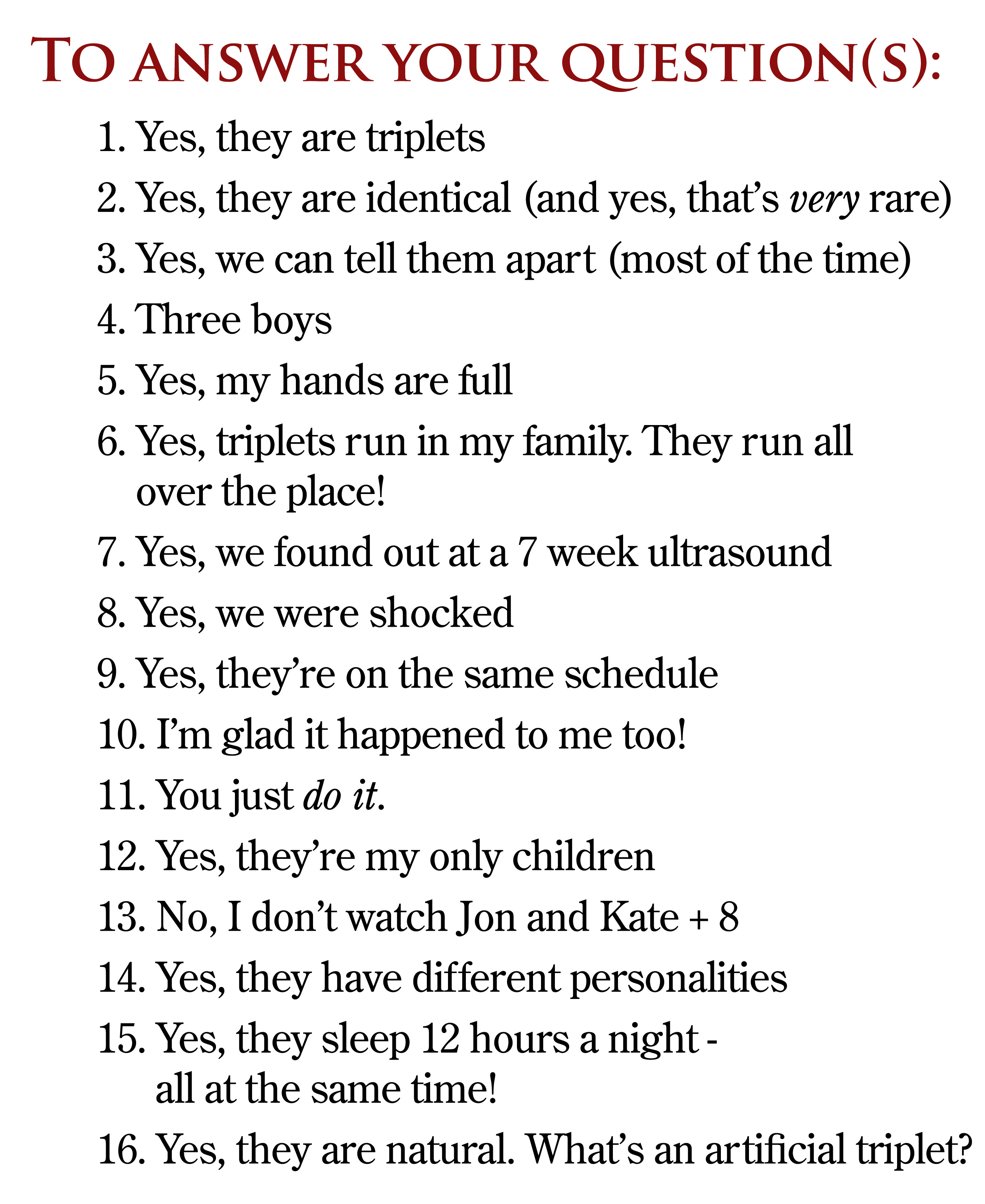 Hee hee. That last one made me giggle. Just a random question that you’ve probably been asked a billion times…if you have a twin, and say “oh, that’s my twin sister” or whatever, what do triplets say? Oh, that’s my triplet brother?