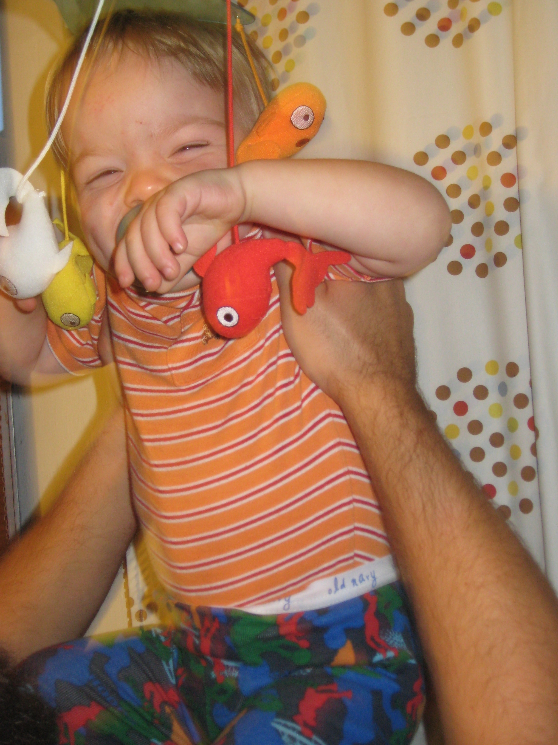 Miles giggling uncontrollably at the “fishie fishie fishie”s. (That’s a mobile that hangs above where the changing table used to be, and when they were tiny, we’d dangle them in the middle of the fishies and they’d giggle and giggle. Turns out they still like it.)