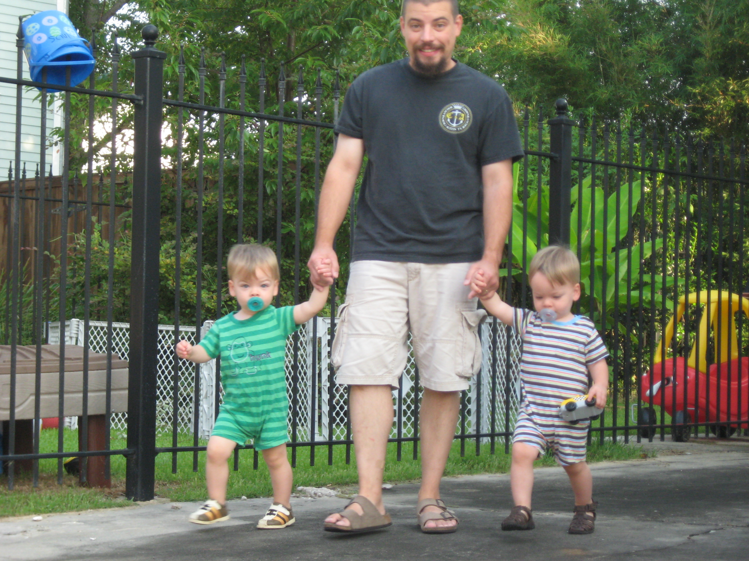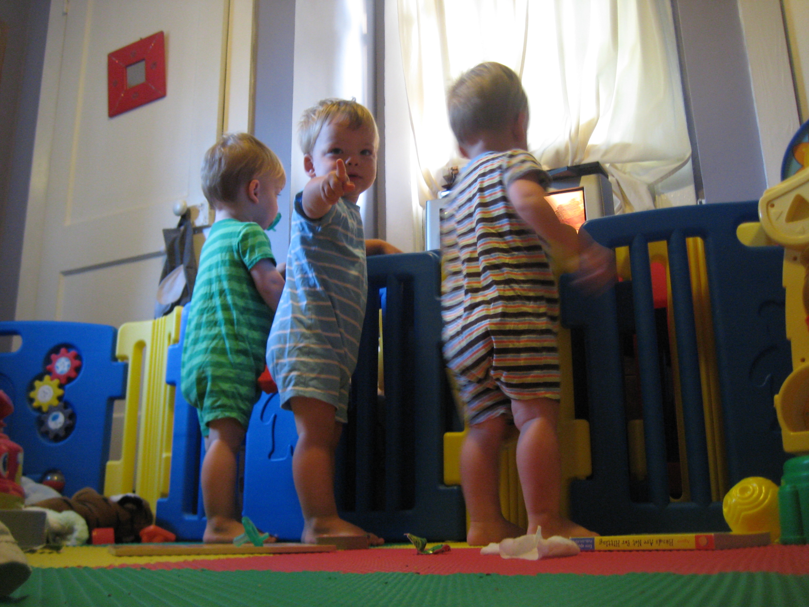 I love the picture of all three boys at the baby gate in their stripes! So cute. π