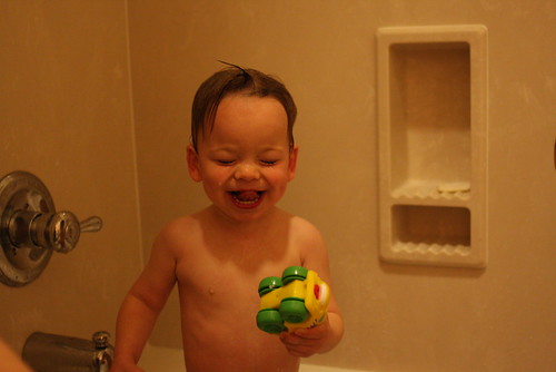 Too cute! I have one bath resistor right now who screams bloody murder when bath is even mentioned and am not sure what to do about it — I’ve been lucky to have happy, enthusiastic bathers up until now! The one who is hating right now tells me she was scared of Grandma’s big bathtub (with jets), so for us, it was Grandma that caused the problem, ha ha! Ah well. I’m hoping seeing her sisters having fun will eventually lure her back in.