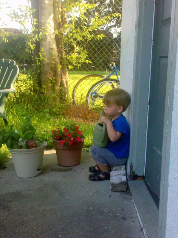 I planted some herbs and flowers in pots and put them by the back door so I wouldn’t forget to water them. Now the boys love checking out the plants and watering them whenever we go outside. (Poor plants are probably going to drown.)