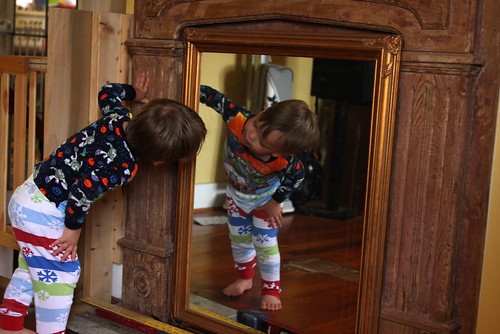 Cute! I often wondered if my twin boys were interested in the mirror in their playgym, or if they just thought it was their brother. Love your use of the mirror, too, BTW.