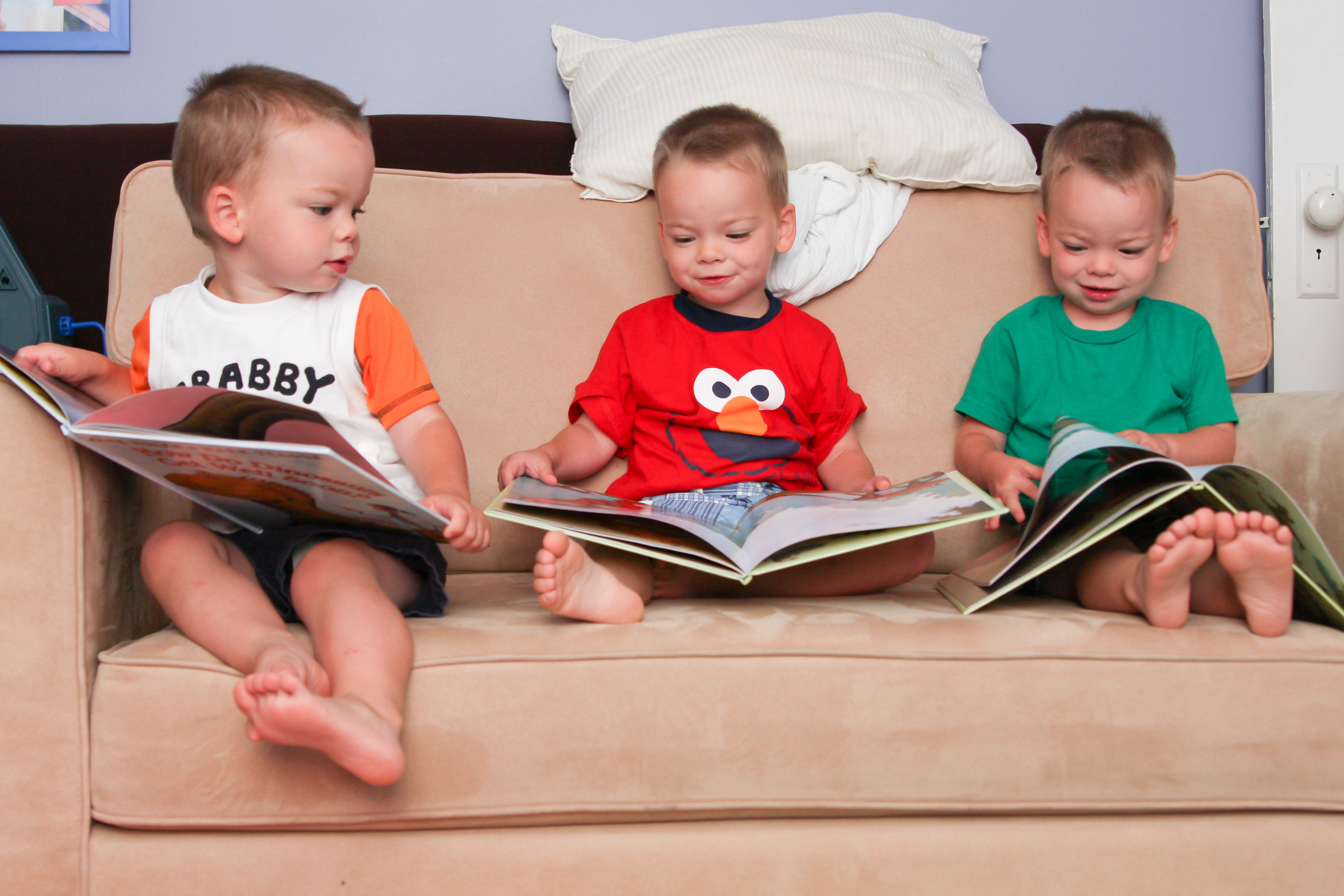 I got two pictures of the boys reading their Dinosaur books (The “How Do Dinosaurs…” series by Jane Yolen and Mark Teague – I adore these books, and have ever since I worked in the children’s department at Barnes & Noble eight years ago) today. This one won out to be the Picture of the Day because of Oliver’s face, mainly. (Oliver-Miles-Linus)