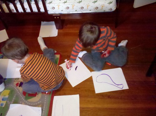 I gave the boys some markers to draw with, and they went to town. All over their hands. After they attempted to wash the color off their hands, they just ended up with diseased-looking appendages. Ah well. At least they draw cute pictures.