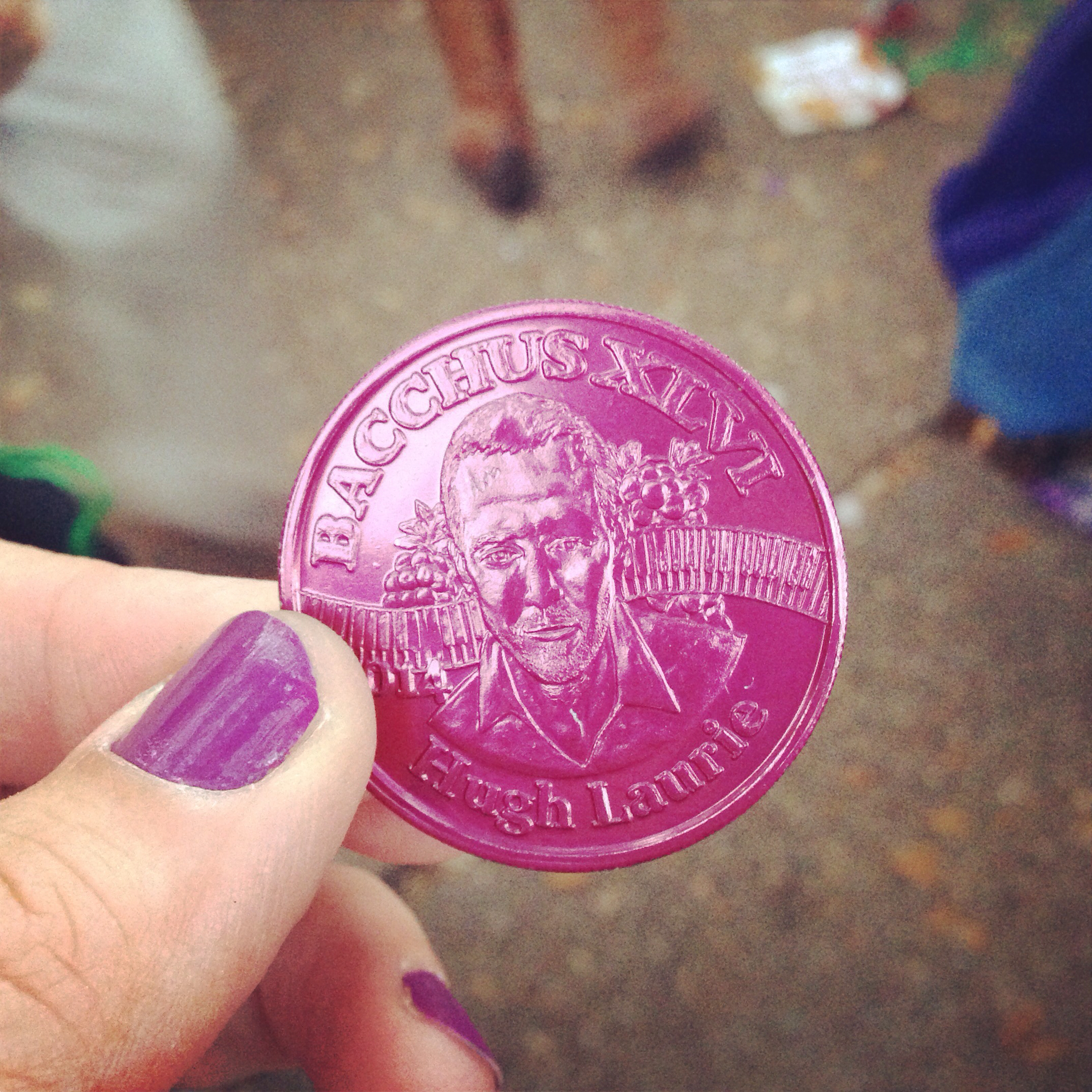 Anyway, the main point is, I got this doubloon thrown by the King of Bacchus, Hugh Laurie. Swoooon. (Though the likeness on the doubloon is terrible, I have to say.)