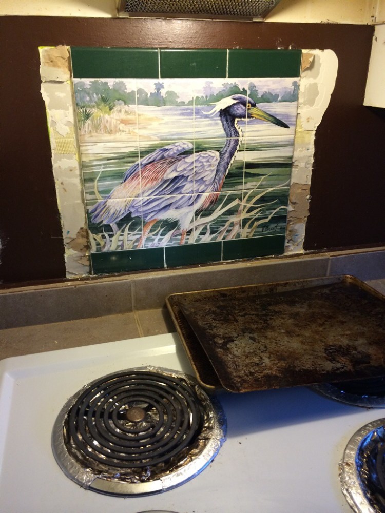 I might have been a little overzealous in my removal attempts. I have always hated this stupid tile backsplash, but it looks like the bird doesn’t want to leave. We’re going to have to cut the sucker out. Worth it.