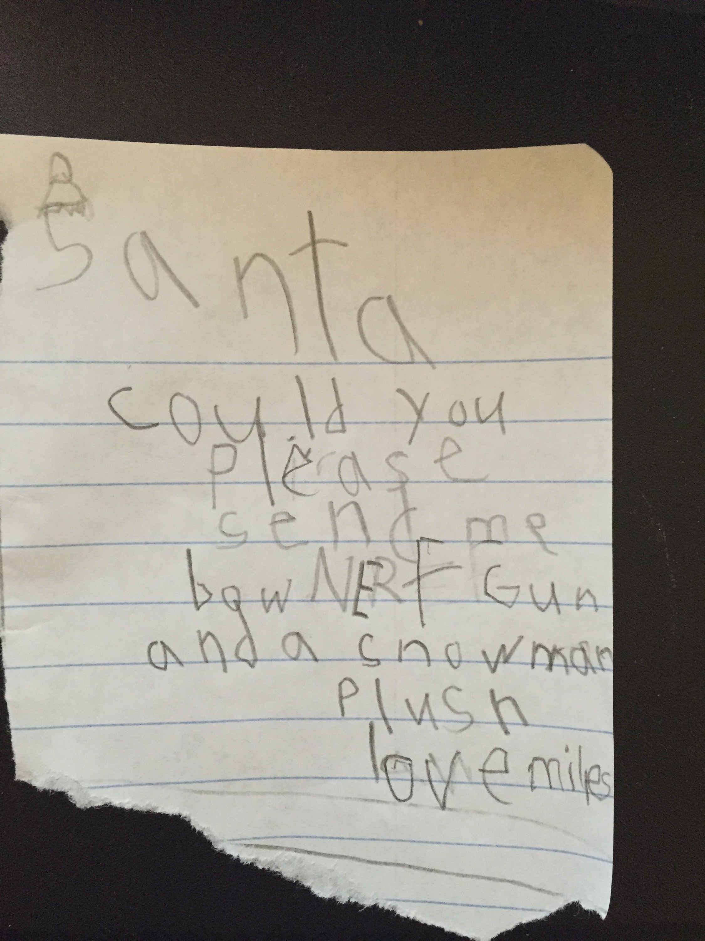 So I had them write letters to Santa. And Maury-Frank (oh yeah, our elf did end up making an appearance) wasn’t going to go back to the North Pole until he had three letters to deliver to Santa. (Well, see, Linus didn’t want to make a list Tuesday night, and then I forgot to move the elf, so I had to make up some excuse for why.) Oh, and Santa doesn’t bring video games. He just doesn’t. I don’t care that other kids get video games from Santa, Linus.