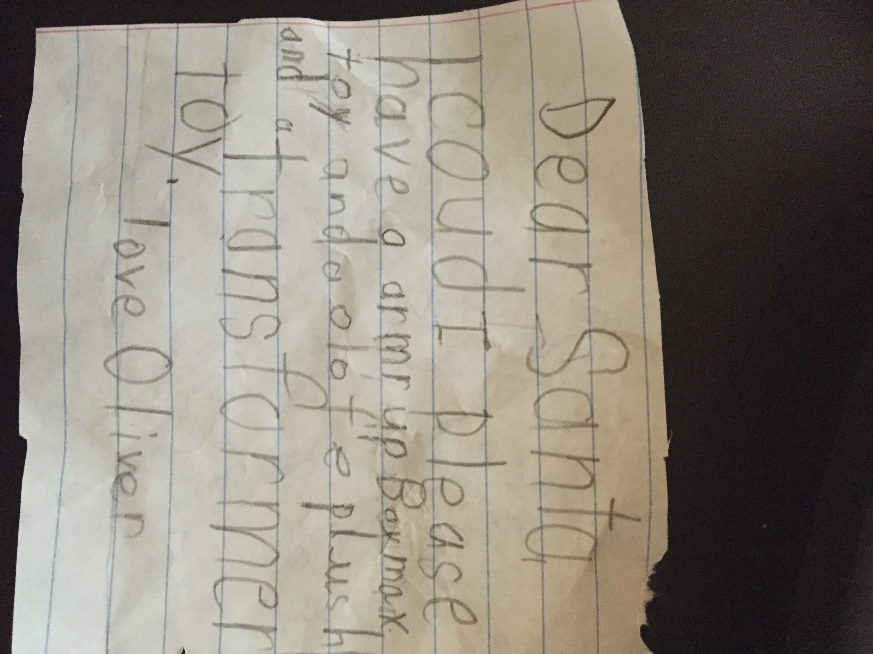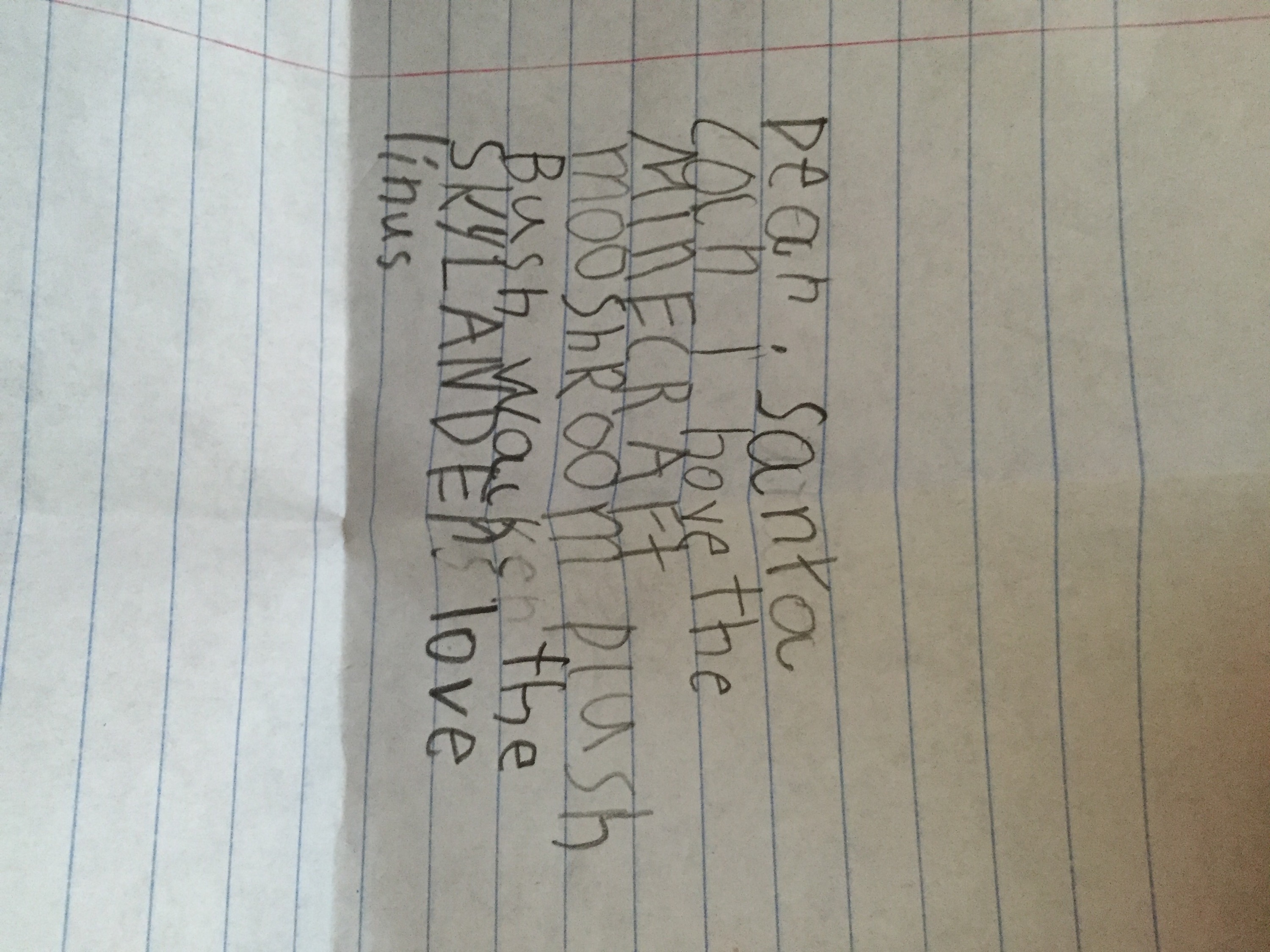 Finally, I was able to get Linus to write his note last night. He said he didn’t want anything that wasn’t a video game, so I said, “just write down whatever,” and got this: