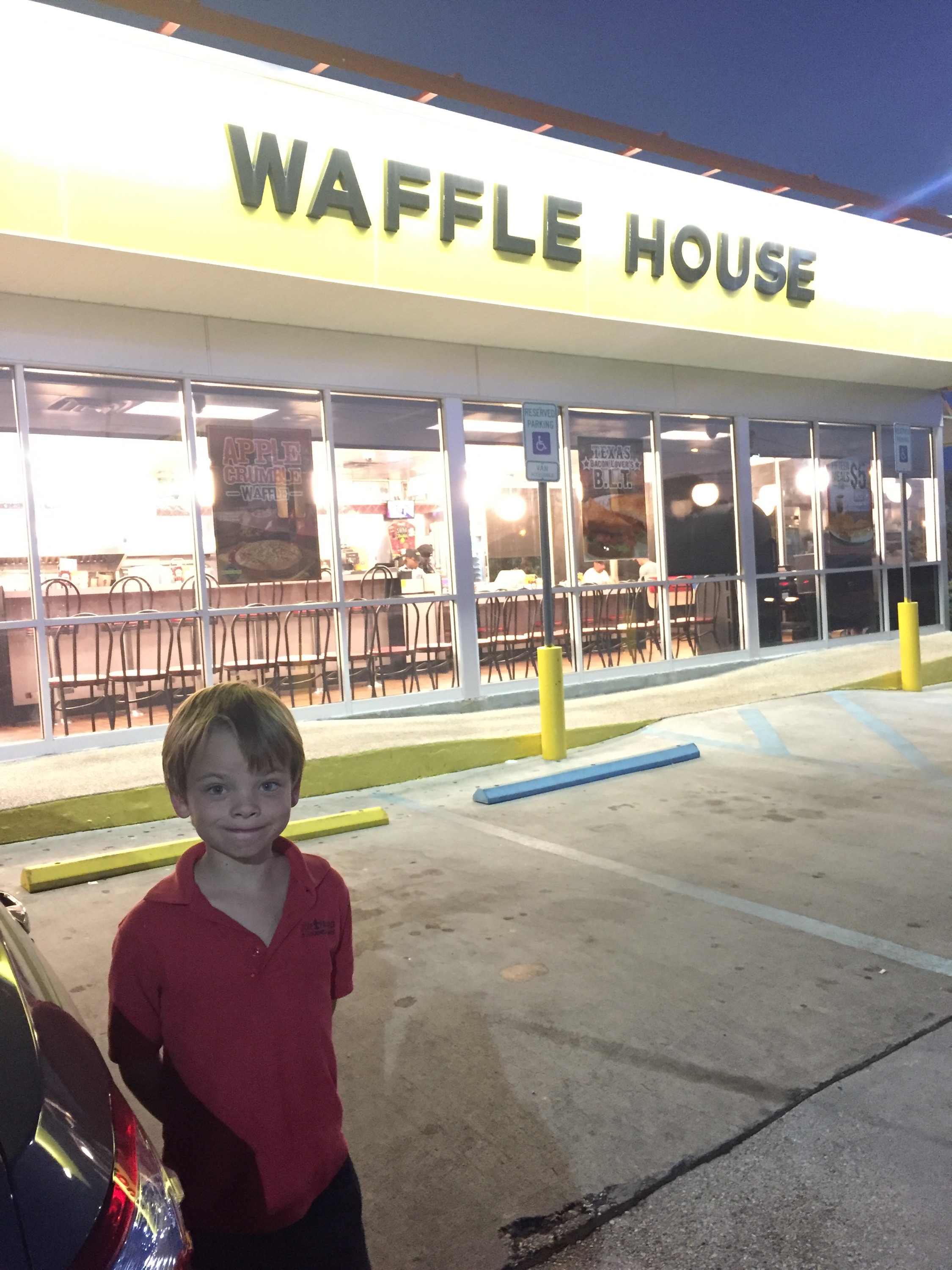 Oliver and I had our one-on-one dinner last night and he chose Waffle House. And it turns out, we’re regulars there now. When we walked in, the waitress said, “it’s the twins!” but she meant me and Oliver, not Oliver and his brothers. Which was cute. And kids eat free Monday – Thursday, so he’s a cheap date.