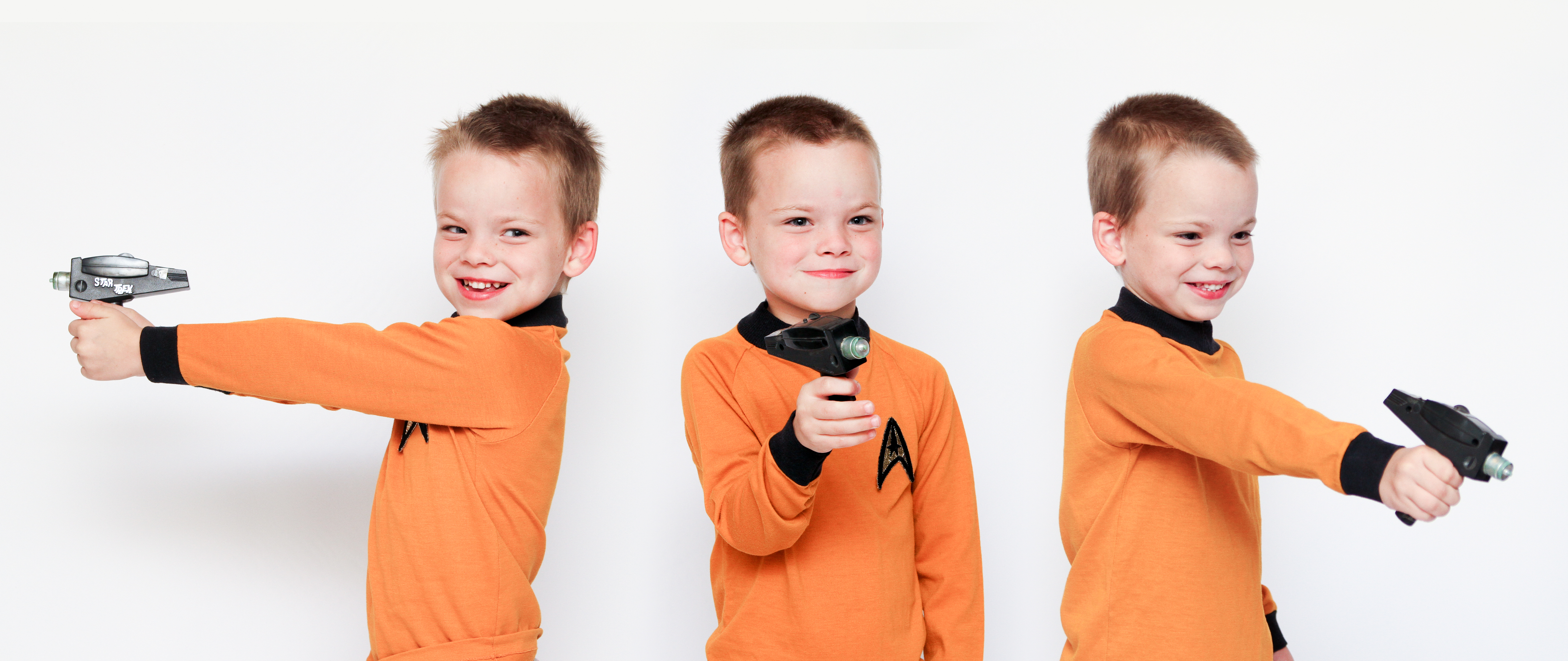 Two years ago, we took a photo of the boys in George’s Star Trek shirt and shooter thingy from his childhood. Since we had the backdrop out anyway, we made them do it one last time. (The shirt barely fit over their heads.)