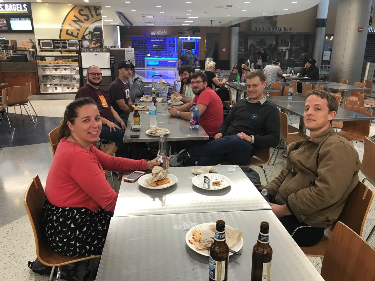 With a bunch of Automatticians in the Houston airport at 11pm at the only open restaurant.