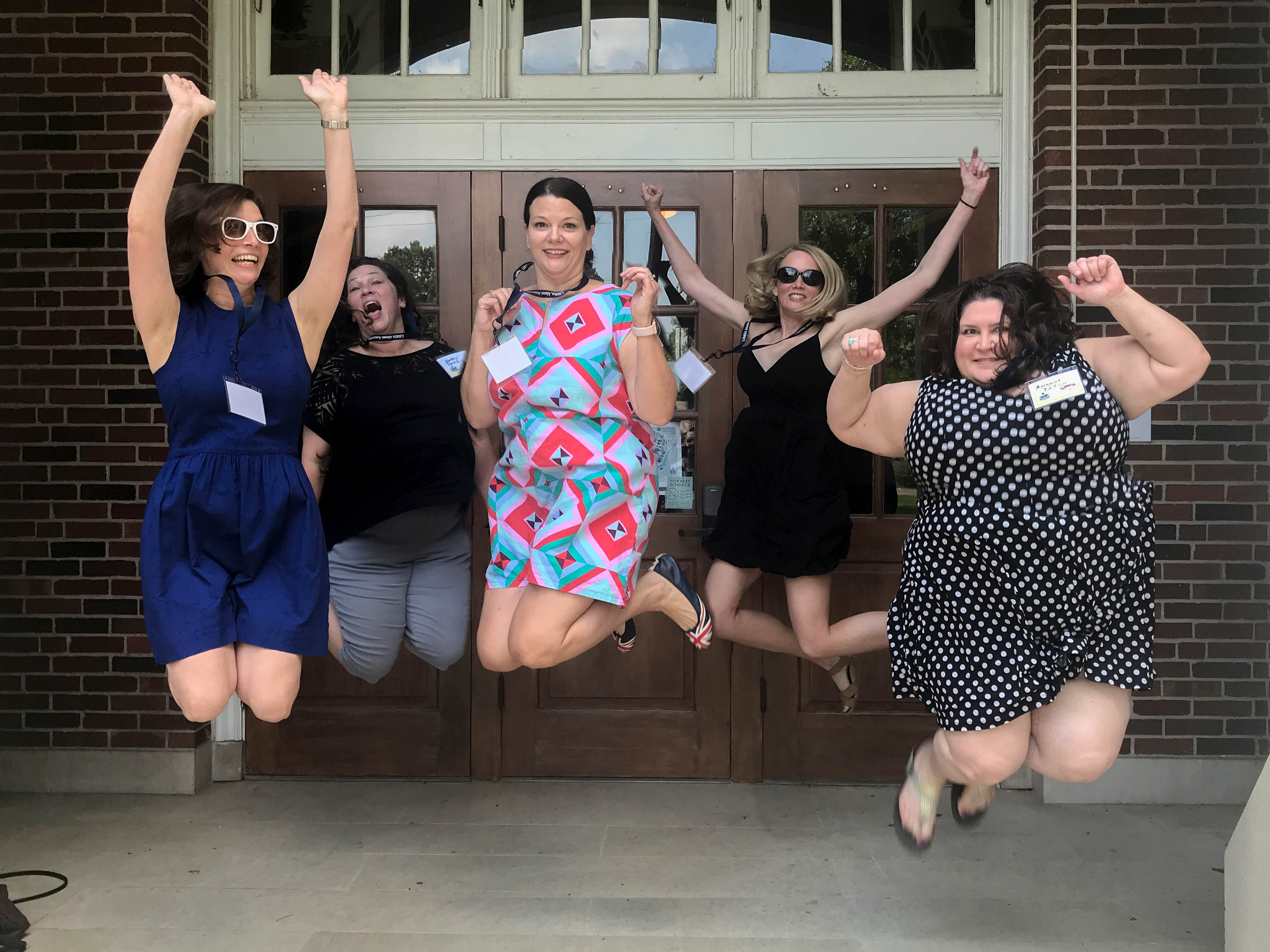 May 19: I wore a lot of stuff I made today, so I’m going to share two pictures. One is this amazing jumping picture with some of my classmates at our 25th high school reunion (wearing my Blank Slate Patterns Leralynn), and the other is the (ahem, self-drafted) skirt I ended up making at the last minute out of this metallic scuba fabric. (The dress I was working on for weeks just wasn’t doing it for me, but I’m going to wear it this weekend.) Ren likes to pose me for pictures. Don’t I look like a (shoeless) ballerina (sitting on a bench in the hallway of the hotel)?
