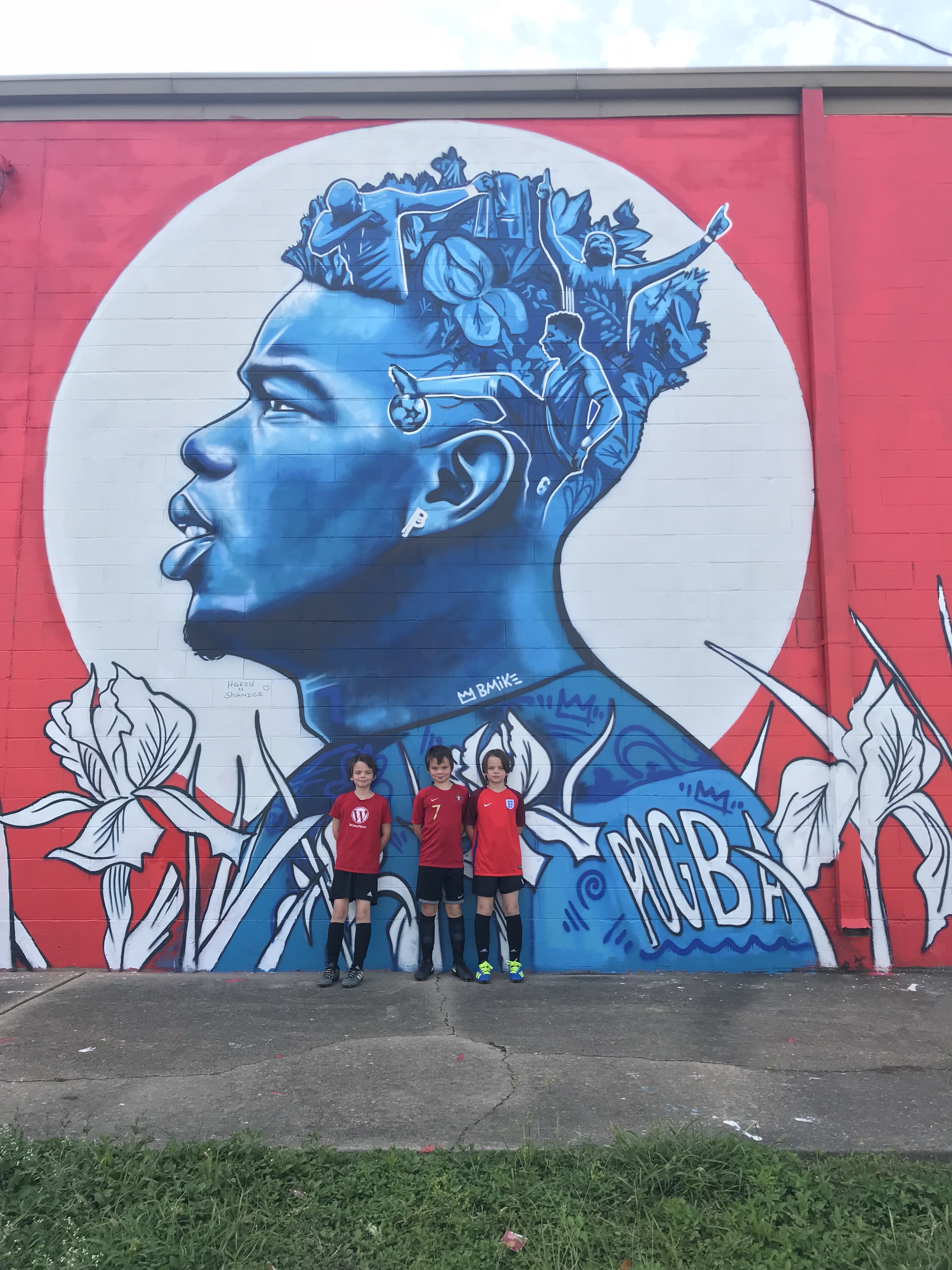 And then the other day, my friend Jenn told me about a mural that a local artist painted last month on the side of a building of a French soccer star. Well, obviously I had to take the boys, so we went yesterday on the way to soccer. It was pretty cool! Oliver was less than thrilled, as this guy, Paul Pogba plays for Manchester United (when he’s not playing for the French national team) and Oliver is a Manchester City fan. Kids.