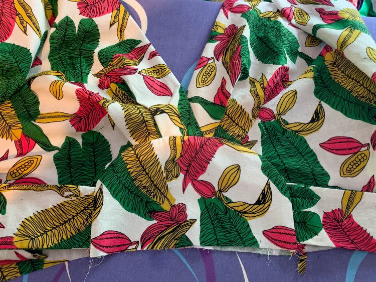 So I got to work sewing up the pattern. Pleats always confound me, but I figured it out (with a little help from the designer and other sewists in the Facebook group.) But then I got stuck again with the semi-circular front insert piece. It was tricky because it uses a sort of burrito method (which I used in the Tropical shirt as well) but I was okay with that. It’s when I got to sewing around the front insert piece and it was just waaaay too big.