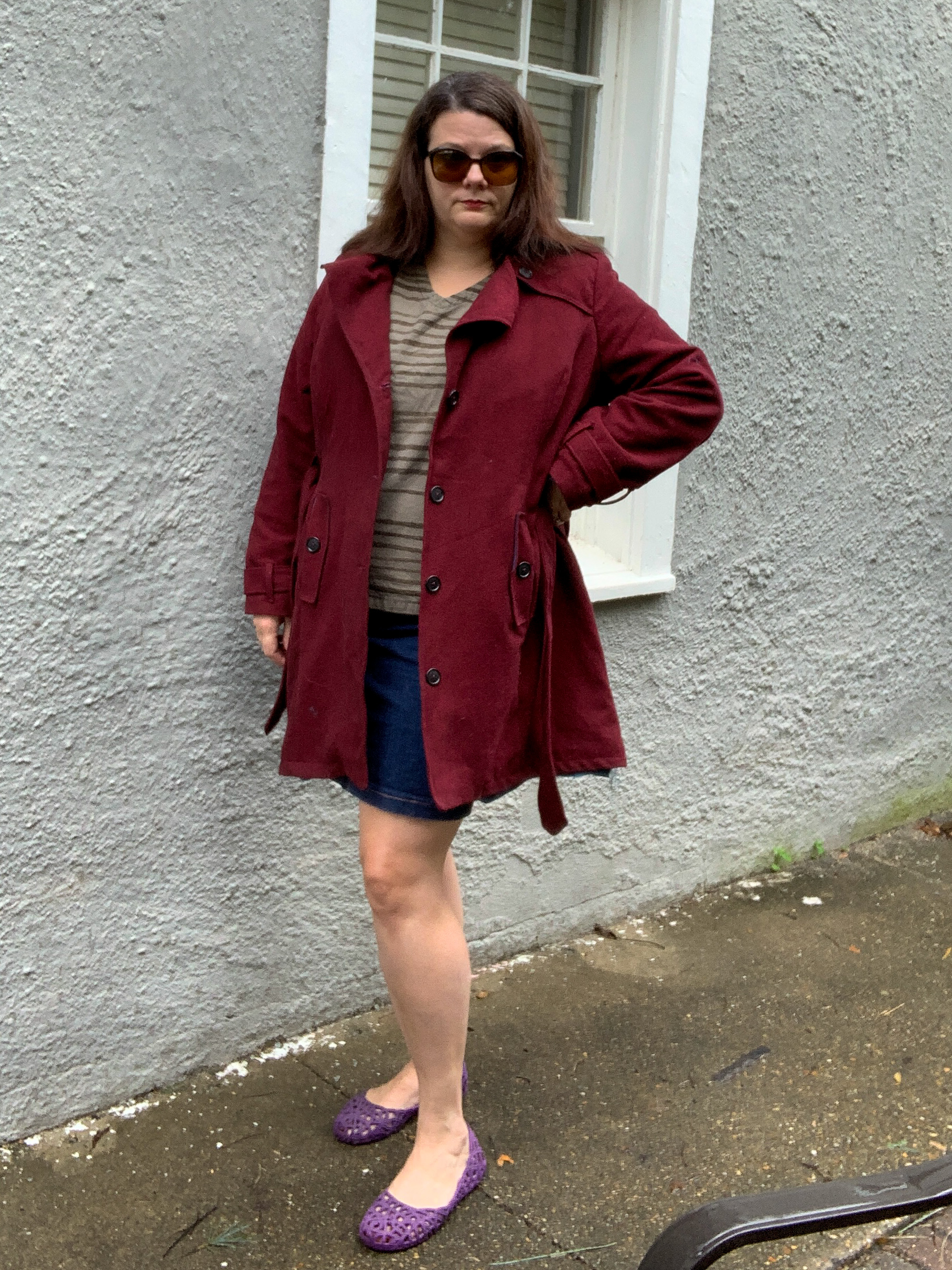 Some various full length shots. Belted! Unbelted! Open! The back! With ill-advised purple shoes! And lots of loose threads I realize now I should have removed but oh well!