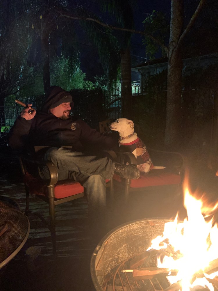 Chilly weekend nights = firepit and Ziggy staring adoringly at George.
