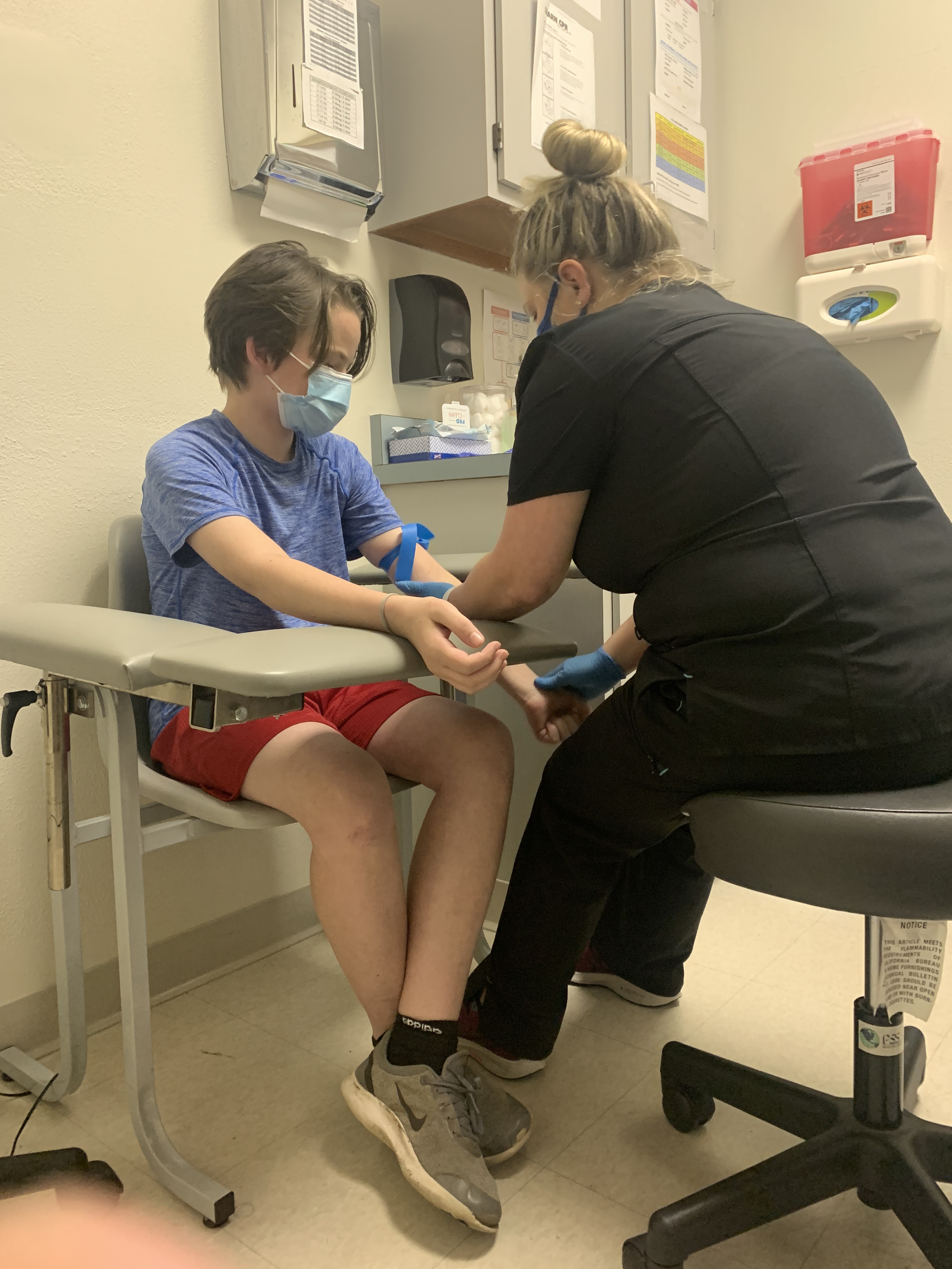 So we were there for about 5 hours. After filling out paperwork, we were put in an exam room where the boys had a brief exam (heart and lungs) and a COVID test. They were taught to use a diary app where they’ll track any symptoms or side effects, and then blood was drawn. Linus went first and it took two nurses and a cool light and a bottle of water and four sticks for them to finally get four teaspoons of blood from him. The other two were a lot easier, but I was so proud of how well Linus handled it all. (I probably wouldn’t have.)