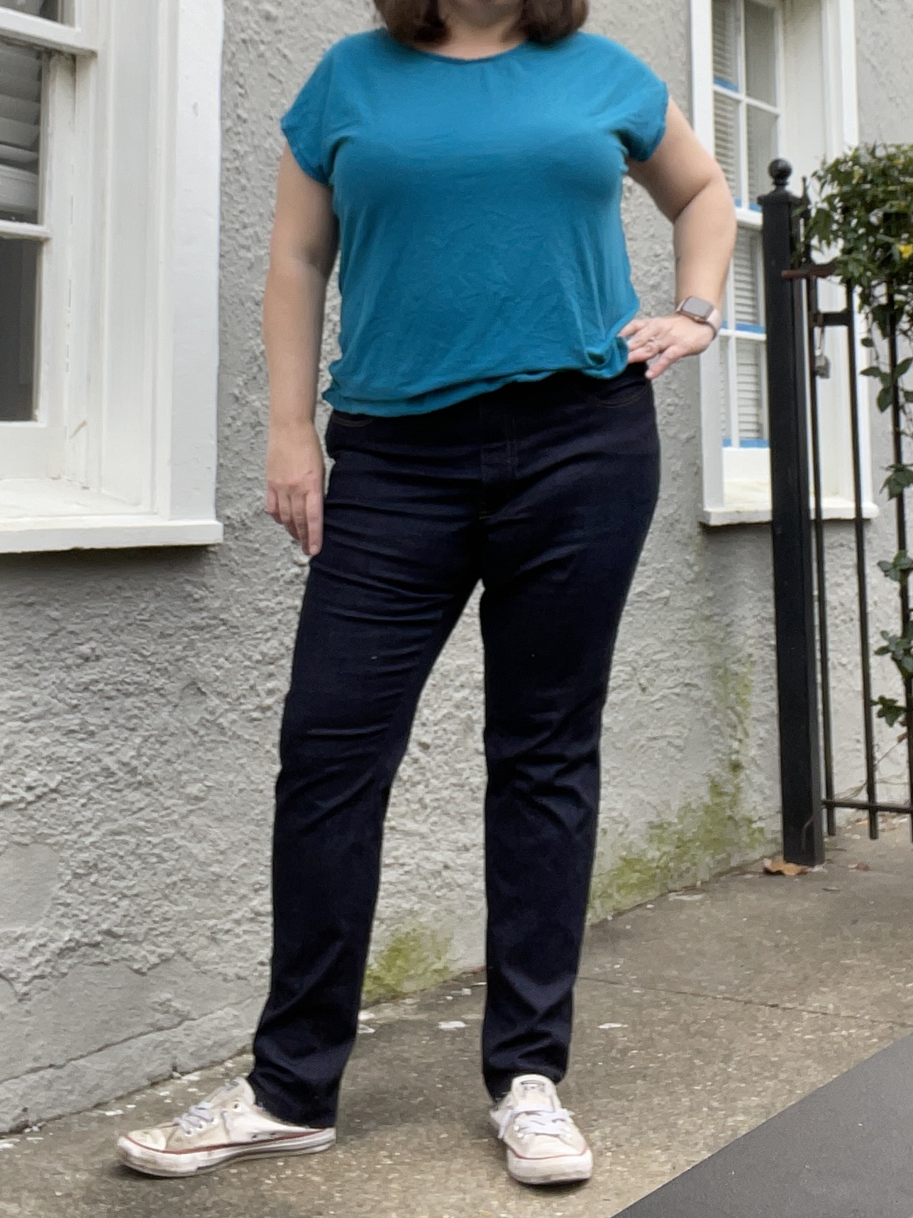 PS We made the Ginger jeans pattern from Closet Core Patterns. (I also had the option of making the Ames jeans from Cashmerette, but I was happy that the Ginger jeans did fit, which I didn’t expect, as they’re not designed for an extended size range. But stretchy denim is stretchy! Not that I would have minded making a plus-size pattern when everyone else was making “standard” sizes, but at least this way we were all using the same pattern pieces and the same seam allowances, etc.)