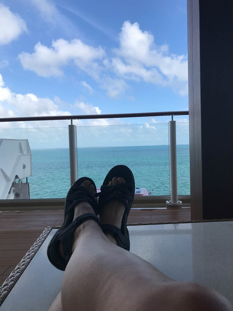 My sister in law and I created a scavenger hunt for the kids for that day. It was fun. I spent a lot of the day sitting in this one spot on the boat that was pretty peaceful (until the bars out there opened.) It was on the 8th deck, and there were big comfy chairs and sofas and I’d sit there and sew (I brought stuff to hand sew scrunchies) or read. Or maybe have a cocktail.