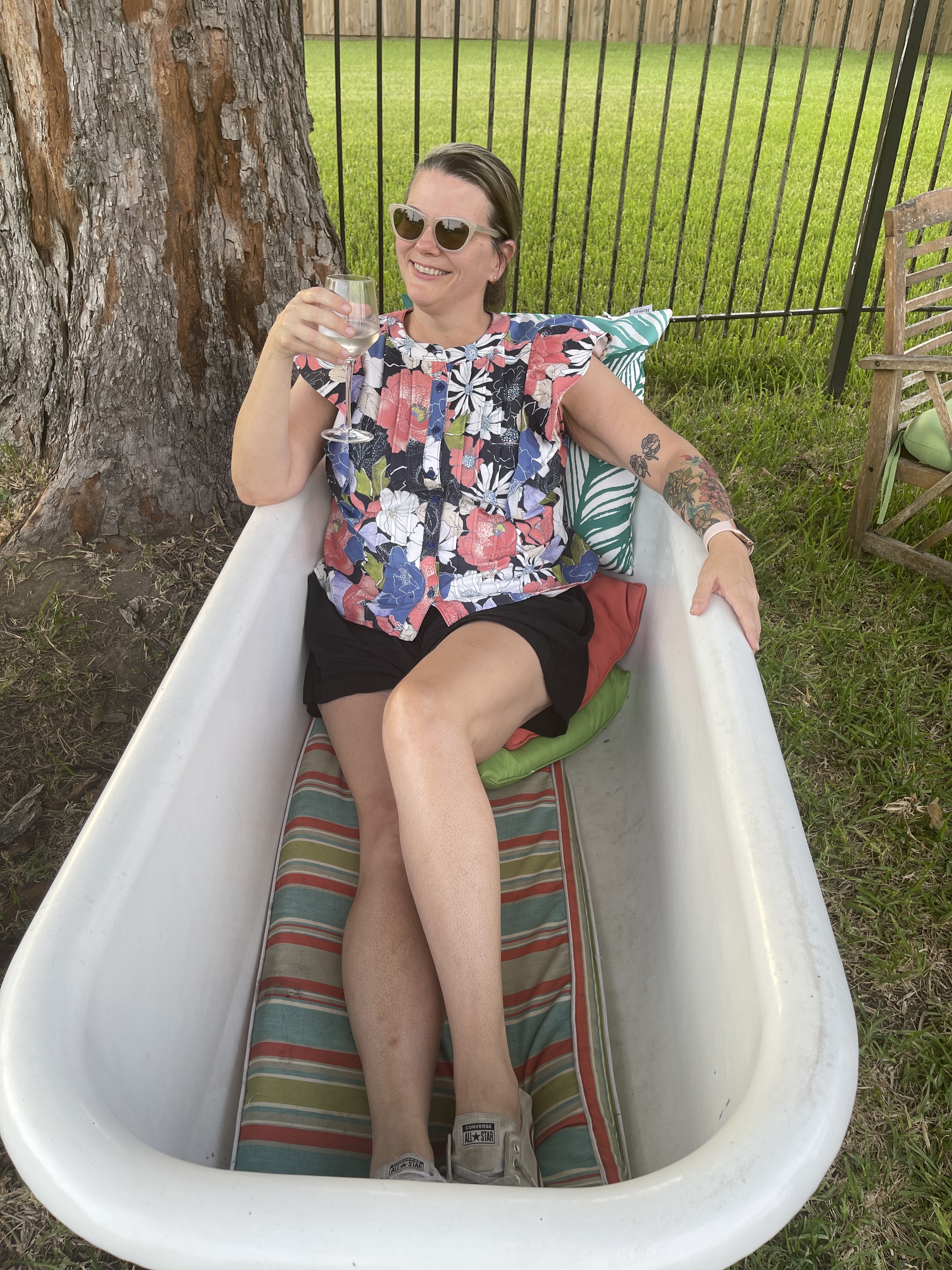 He came home last week, and since then, life has gotten significantly quieter (that’s good.) Oh, I made this (Selwyn by Cashmerette) shirt early in the month, but I haven’t been able to get a good picture of it, so after a few glasses of wine, my friends stuck me in a bathtub to get some.