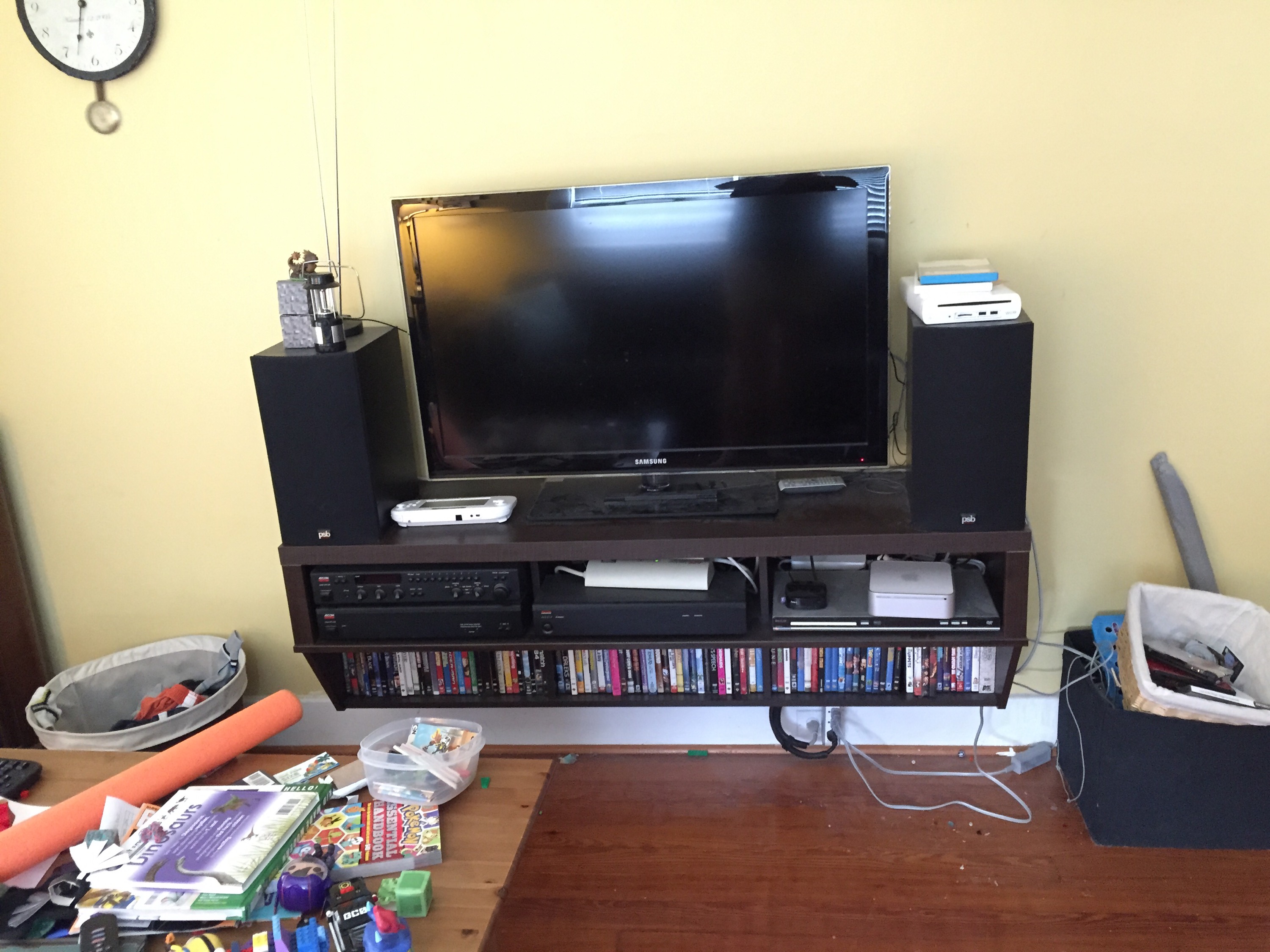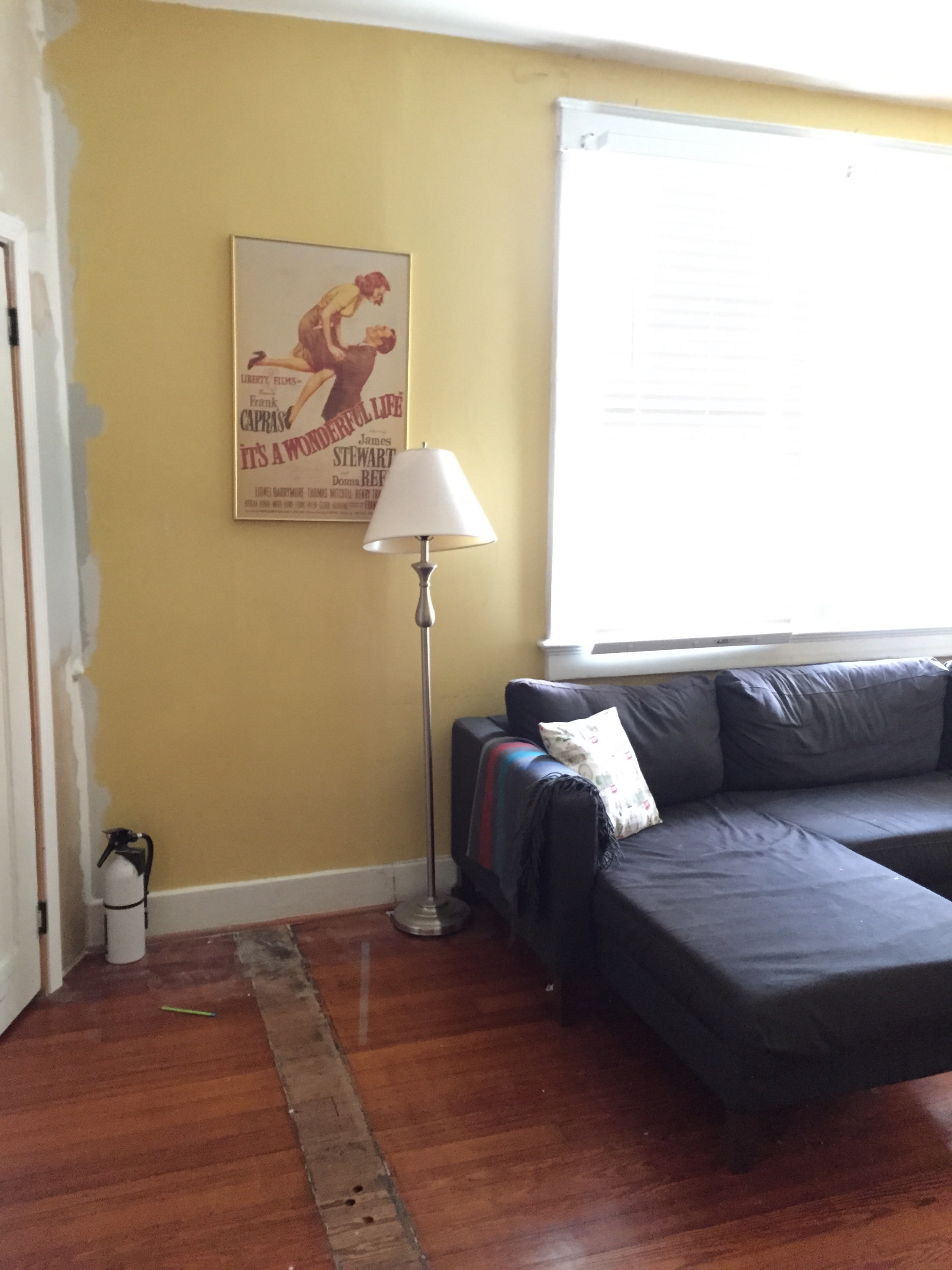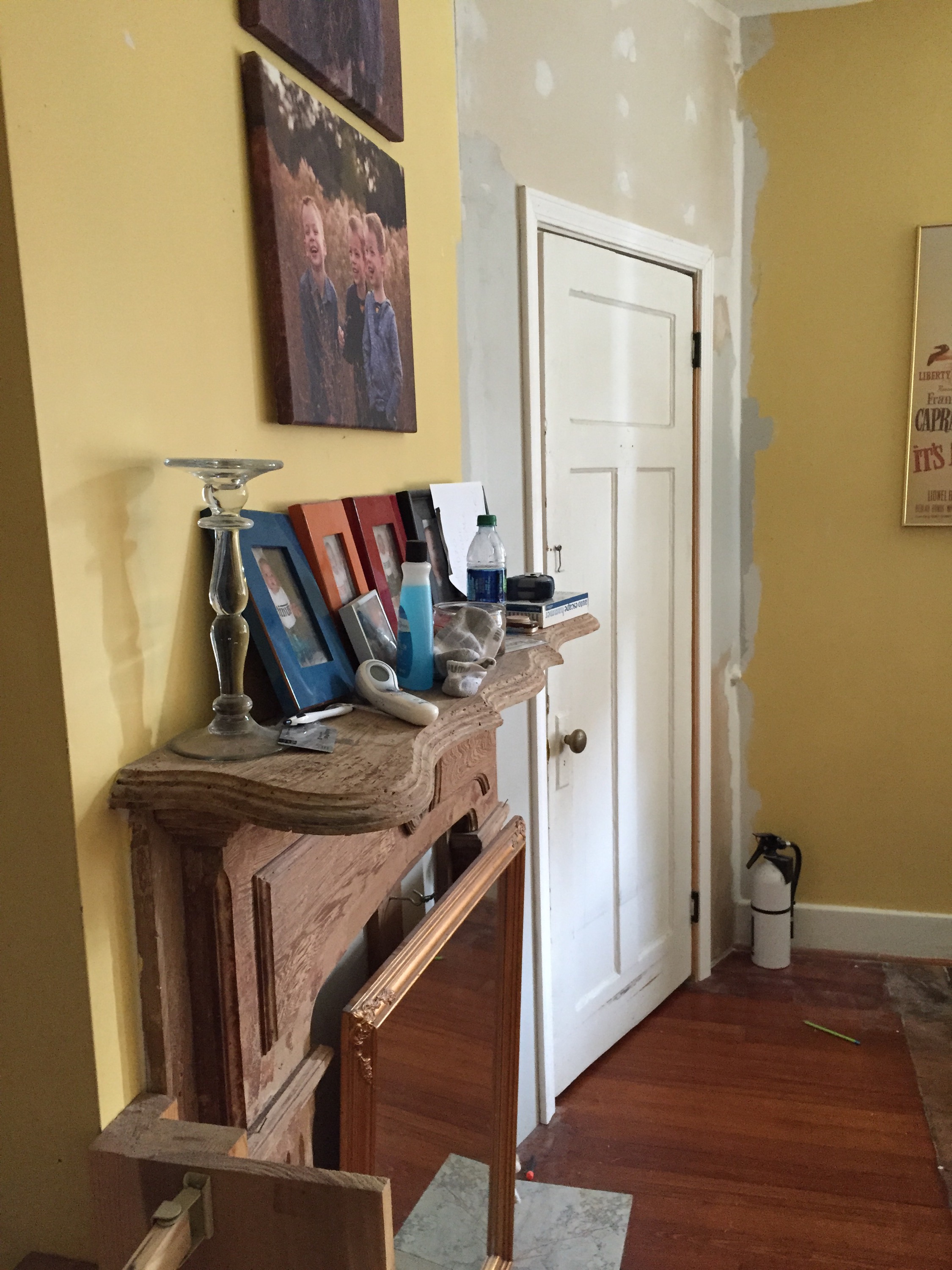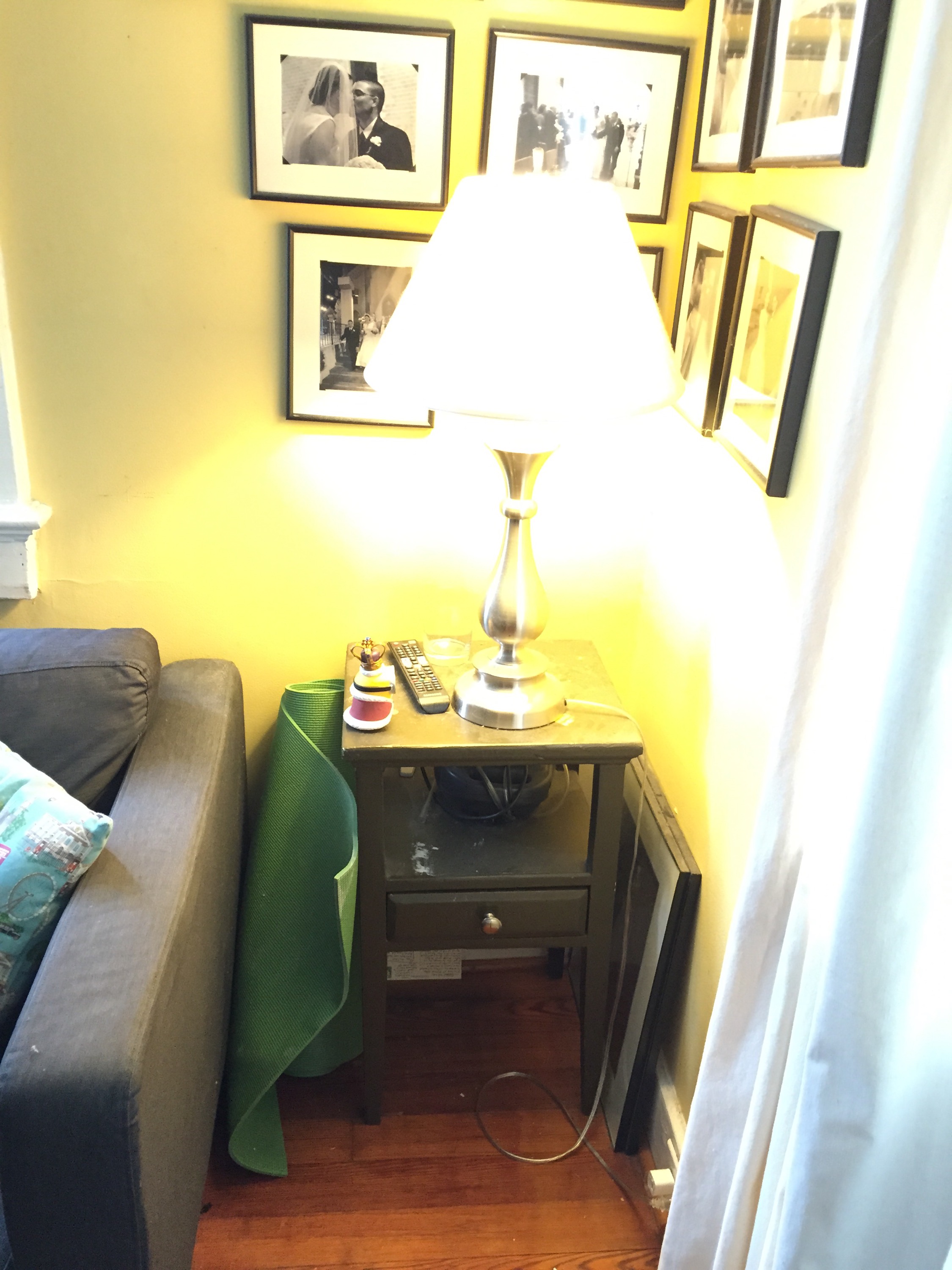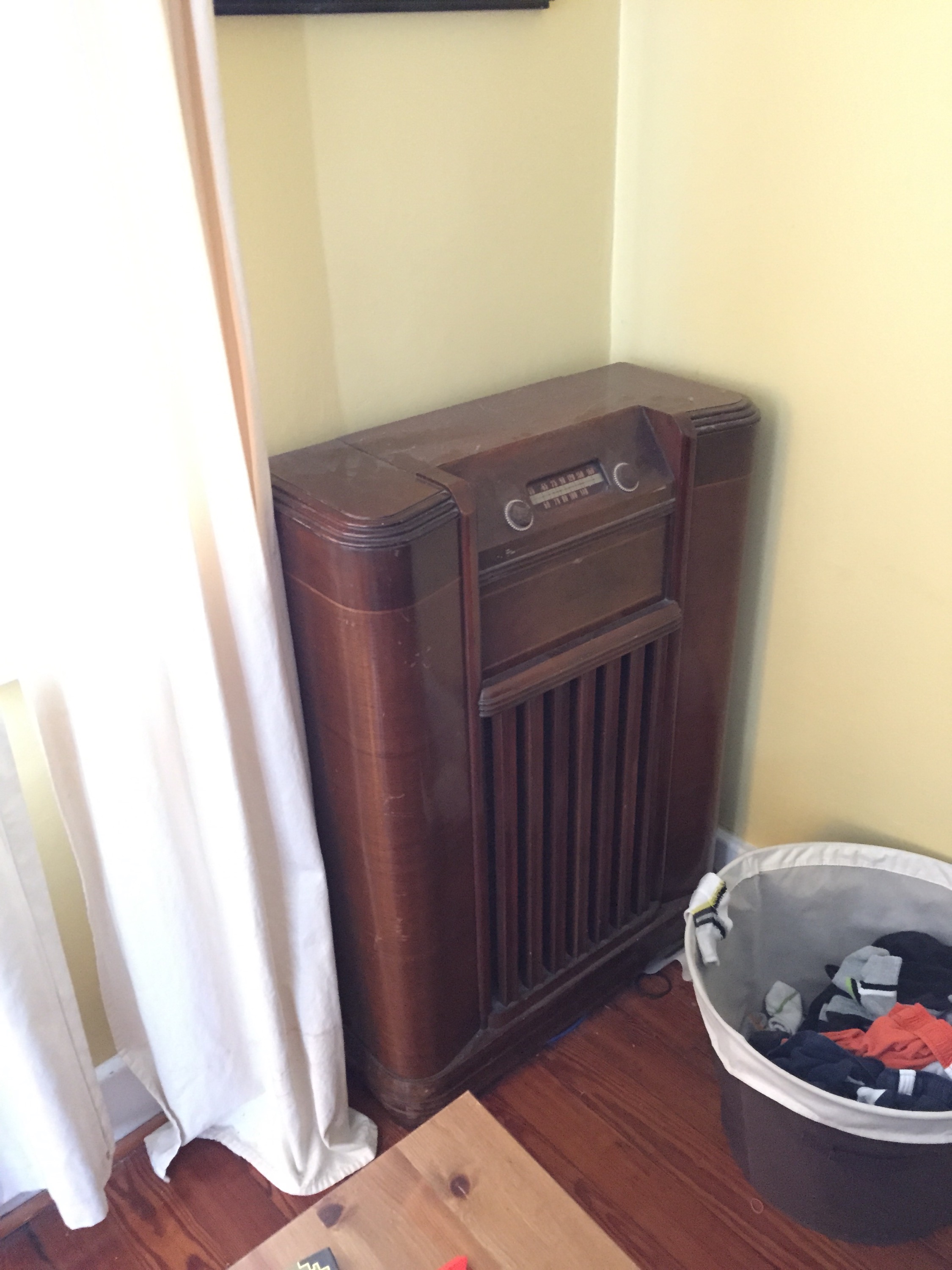 You can see the mantle, which I don’t want to mess with. Except there’s a mirror in front of it – it’s just a mantle on the wall, no hole or anything, so I’m not sure what else I could do there, but I’m open to suggestions. You can also see I finally got the door way to our bedroom finished. George and his dad started that project 6 years ago. Now it can finally be painted.A straight-on view of the mantle. The color you see to the right is the color I’ll be painting the whole room.Moving clockwise around the room. The mark on the floor is where a wall used to be, originally. I kind of like it, it shows the history of the house. In any case, we have to get other parts of the floor fixed eventually, so you can just ignore the floor altogether.I love my sofa. It’s dark gray from IKEA.I should be emotionally attached to this table, it was my mom’s, and then I used it growing up, but I kind of hate it. It’s tiny and useless and ugly. So I want to get rid of it. I’ve painted it so many times it’s probably an inch bigger than it was originally. 😛Behind the curtains are the front doors of the house. We don’t use those doors, but we also don’t want to completely block them. But I’m open to changing how we “cover” them, which we do for privacy, mostly. I hate that coffee table.The old radio. I think George might be open to getting rid of it. I don’t really care if we do keep it, but it just takes up space and is generally useless.I actually like our TV stand, though the cords from the Wii make me crazy. I may just end up moving the Wii (and another TV we have) into the boys’ room. Which I always resisted, but they don’t play it all that much anyway.The area to the right of the TV stand. Note a bin of Wii shit on the floor. Random shelves on the wall. That’s all going away.
