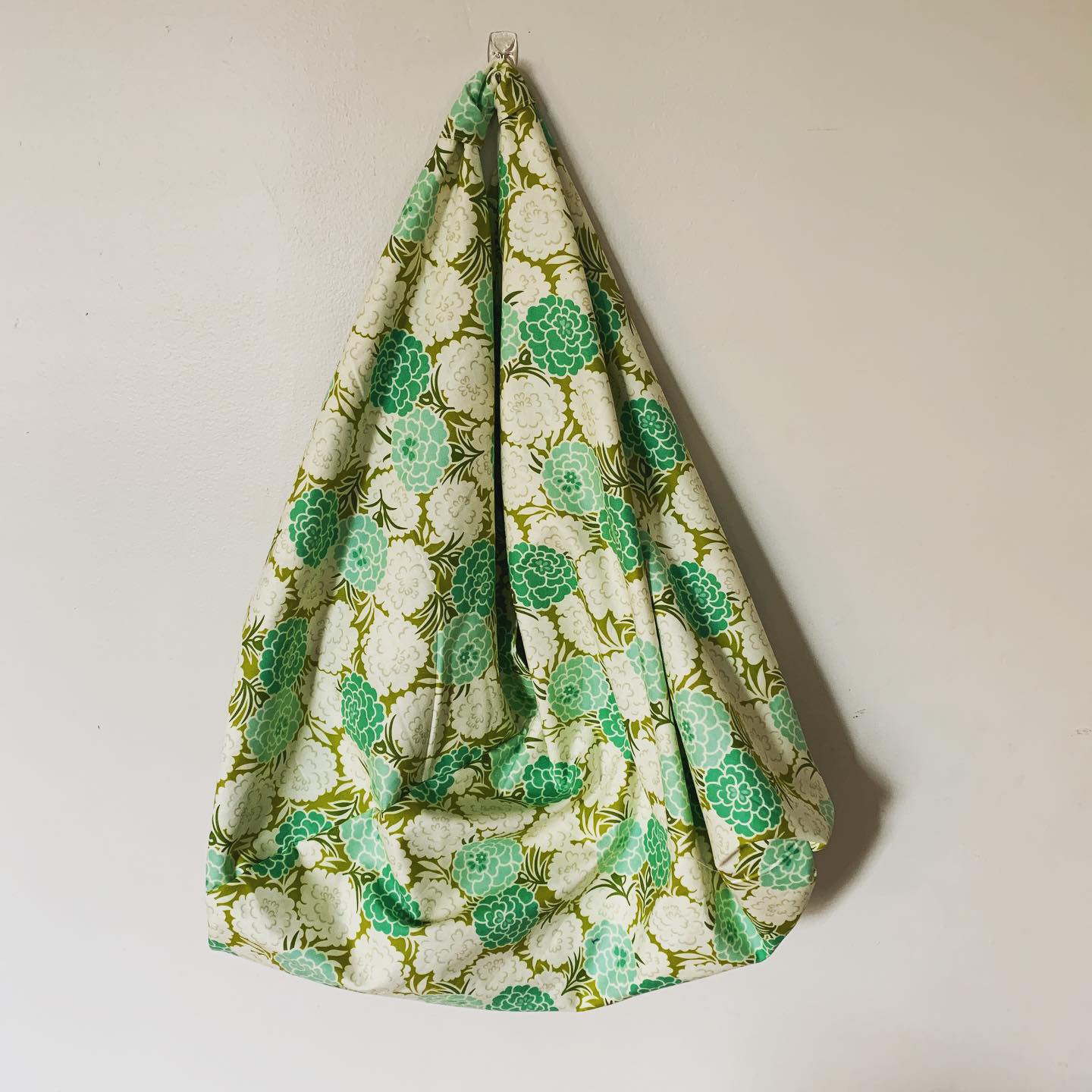 Large origami tote with faux leather handle. This one is not lined, but the fabric is strong! Approximately 28″ wide at the bottom. Price includes pick up or drop off in Algiers Point. 1 available. See photo larger here.