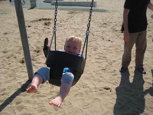 Went to the beach! Linus did not enjoy the water nor the sand, but did like the swings.