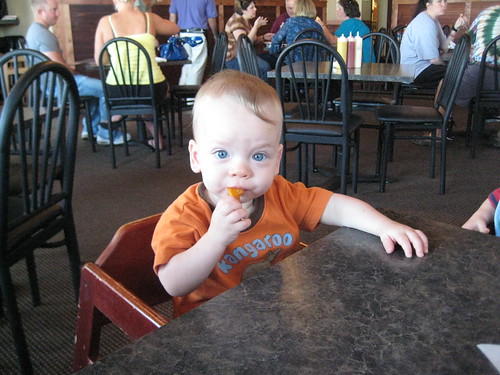 Got up while it was still dark out. Sob. Got Linus up and dressed and to the airport. Had much fun lugging 24 lb baby in Bjorn (over the weight limit, shhhh), suitcase, huge carseat, and diaper bag. Made it onto plane without incident. We were moved to Economy Plus (yay!) and had our own row, as well as empty rows in front of and behind us.