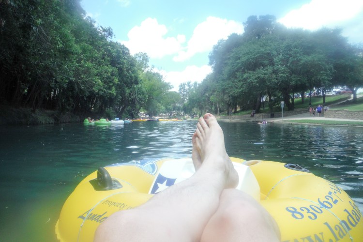 Today, on the advice of a pal, we took the kids tubing in New Braunfels, on the Comal River. (We being Deborah, her husband Tom, and our coworker Elizabeth; kids being my three and Deborah and Tom’s two.) I bought a Texas-themed Igloo cooler just for the occasion. (And I mean, what other states do this? Where else can you buy coolers with the state flag, and in what other states do all hotels have state-shaped waffle irons? Are there any other states like Texas?)