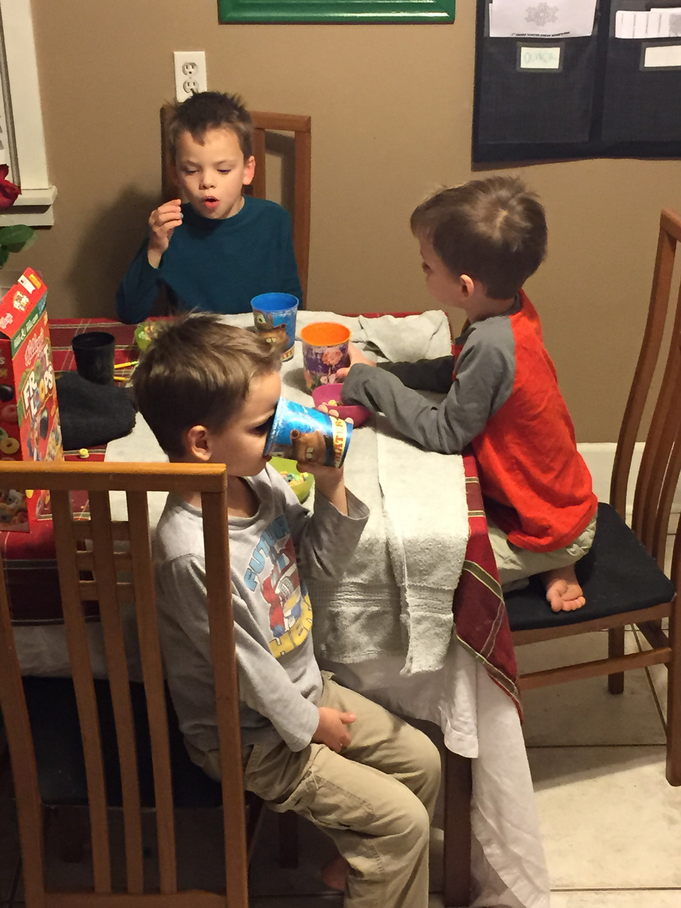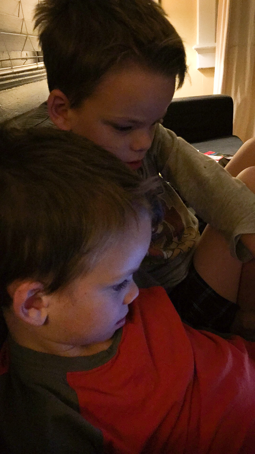The boys played video games, we watched some TV, I put on a movie, and I gave a late snack of sugary cereal.