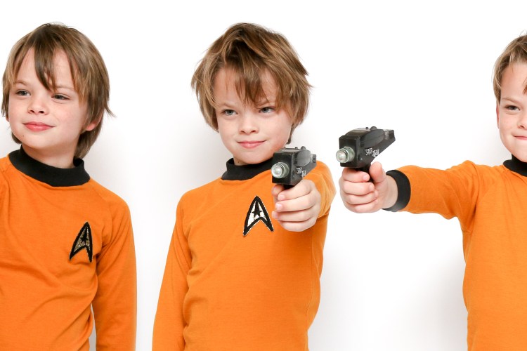 Two years ago, we took a photo of the boys in George’s Star Trek shirt and shooter thingy from his childhood. Since we had the backdrop out anyway, we made them do it one last time. (The shirt barely fit over their heads.)