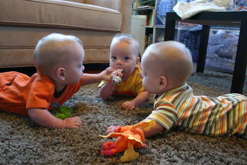 That definitely paints a hilarious mental picture, mostly of babies wriggling in circles and then giving up and just sucking on each other’s feet before falling asleep in puddles of drool. Unfortunately, since only Linus is an adept scooter, I think it would give him an unfair advantage.