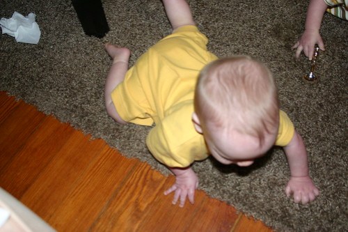 Linus is getting so good at scootching on his belly. He was “chasing” George, trying to get a pacifier that Daddy was taunting him with.