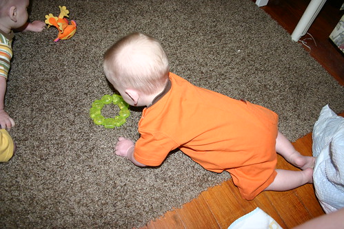 Linus is getting so good at scootching on his belly. He was “chasing” George, trying to get a pacifier that Daddy was taunting him with.